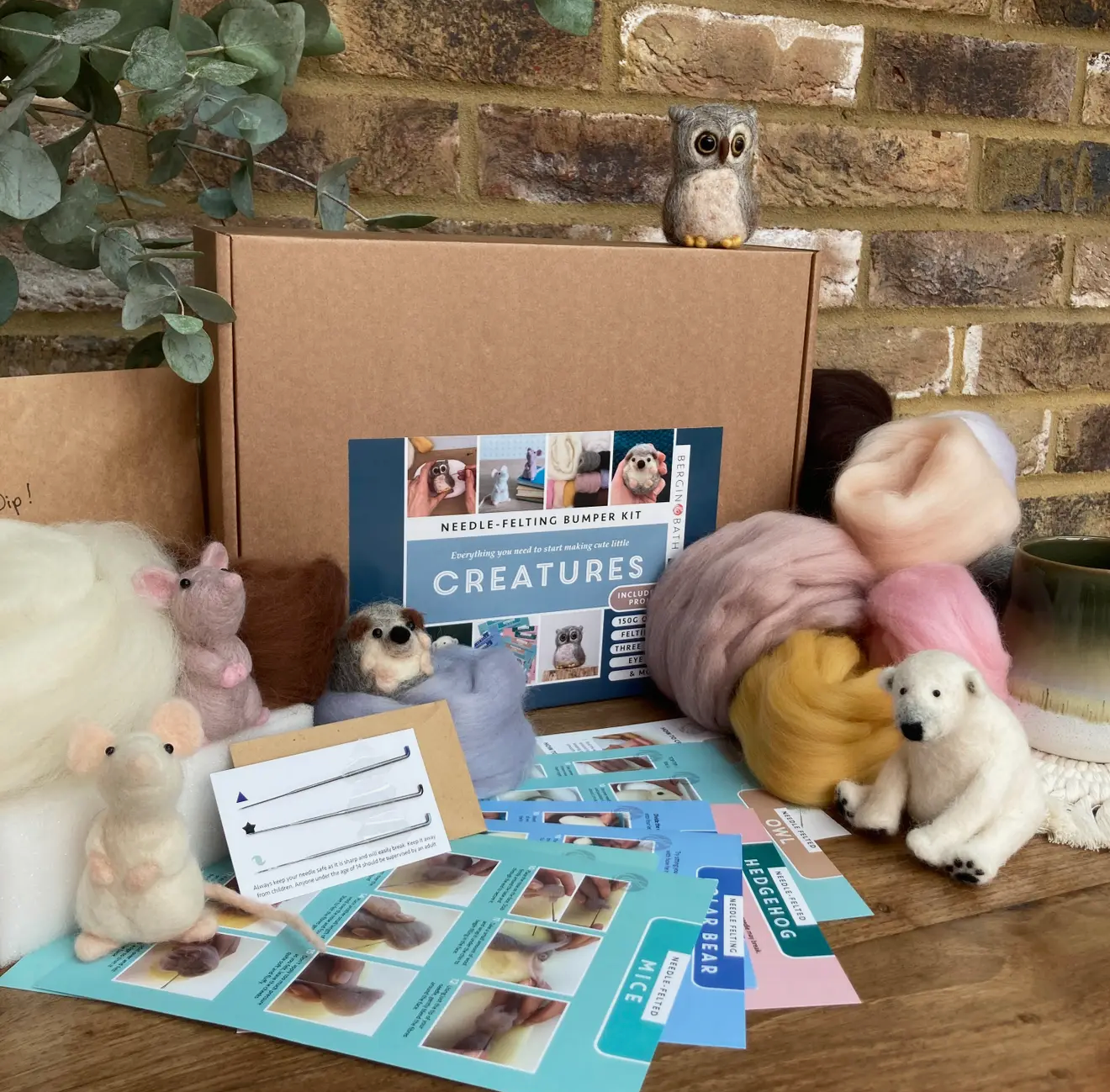 The Bergin + Bath Creatures Beginner Needle Felting Bumper Kit is needle felting hobby set packed full of high-quality, cruelty-free natural wool, felting needles, eye pins, felting mat, armature wires and instructions to make three cute creatures wrapped up for winter.