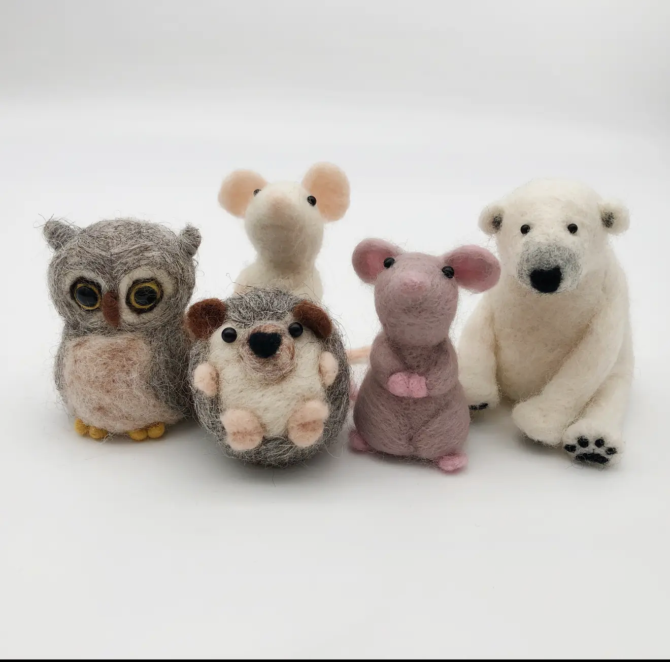 Packaged in a stylish display box, this kit includes a beautiful selection of fibres, hand-picked for making all sorts of sweet little creatures, and four sets of step-by-step photographic instructions that show you how to make a polar bear, a pair of cute mice, a hedgehog and a lovely little owl. There’s enough wool in the box to make all of these and much more!