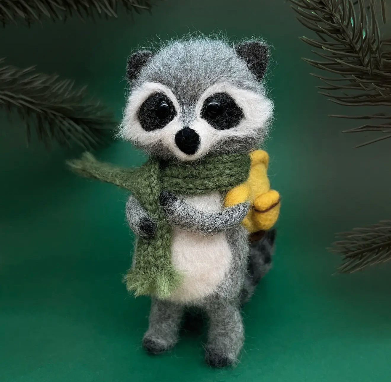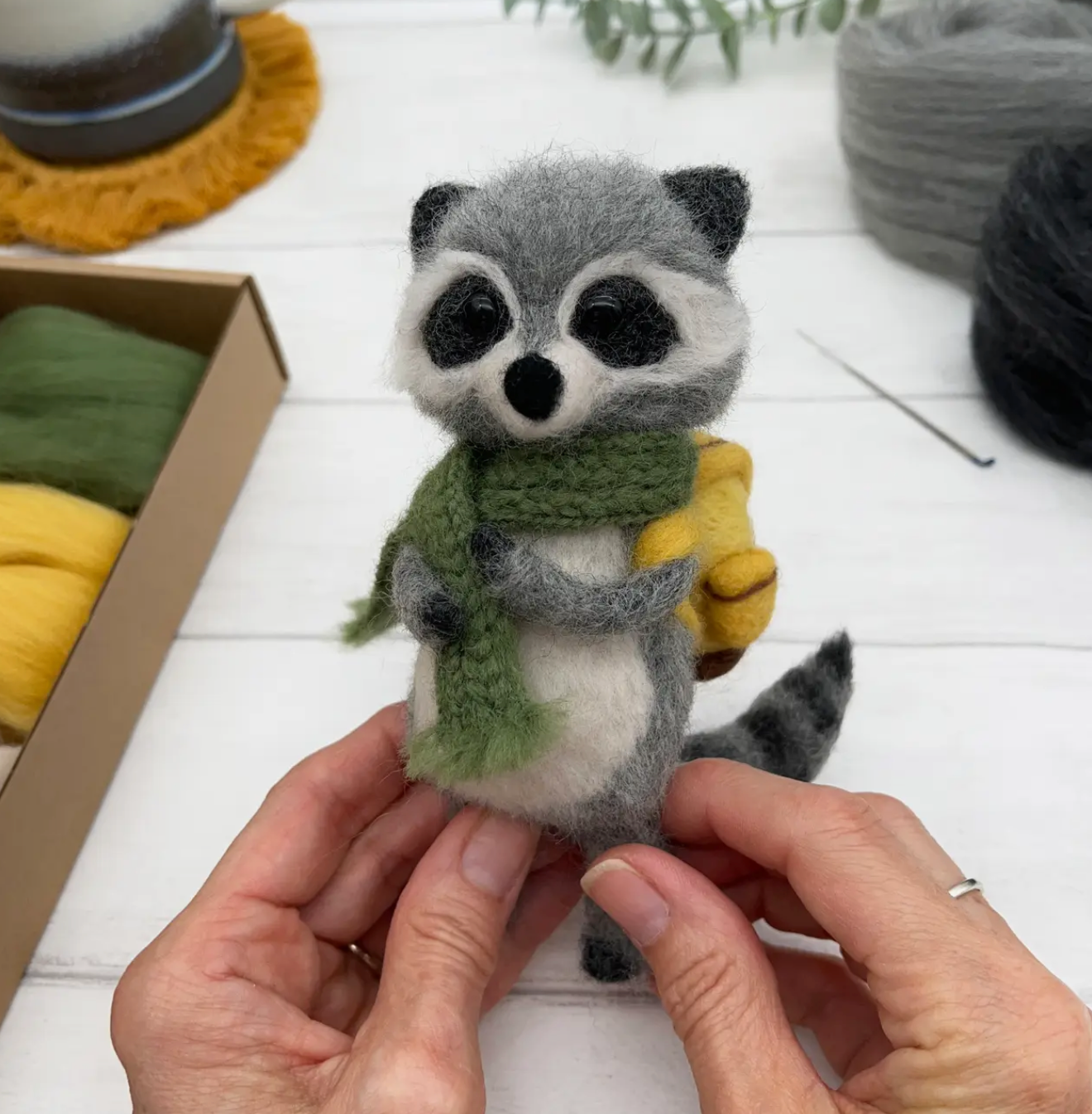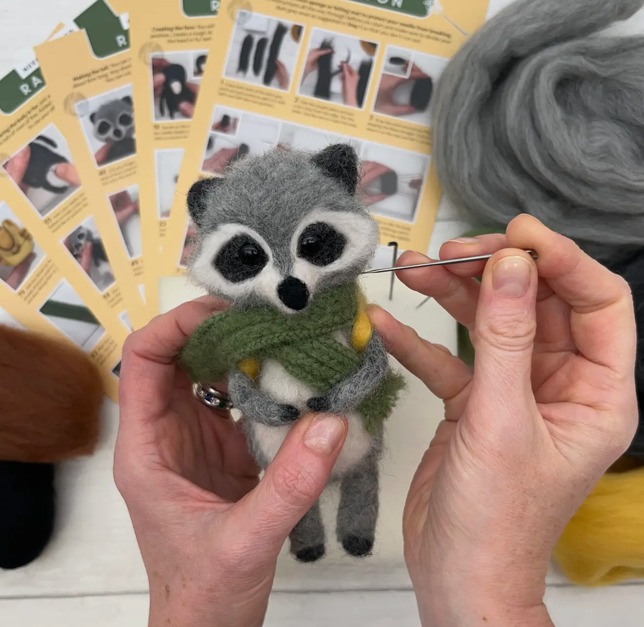 Needle felting is a form of sculpture using a barbed needle and carded wool roving. It is easy to master and the techniques are fairly simple and repetitive. Just like any other craft form, it takes a little practice and every new project you try will teach you something new. This kit has been designed for people who love making things with their hands. Anyone who enjoys craft can give this project a go and make a cute little raccoon to be proud of.